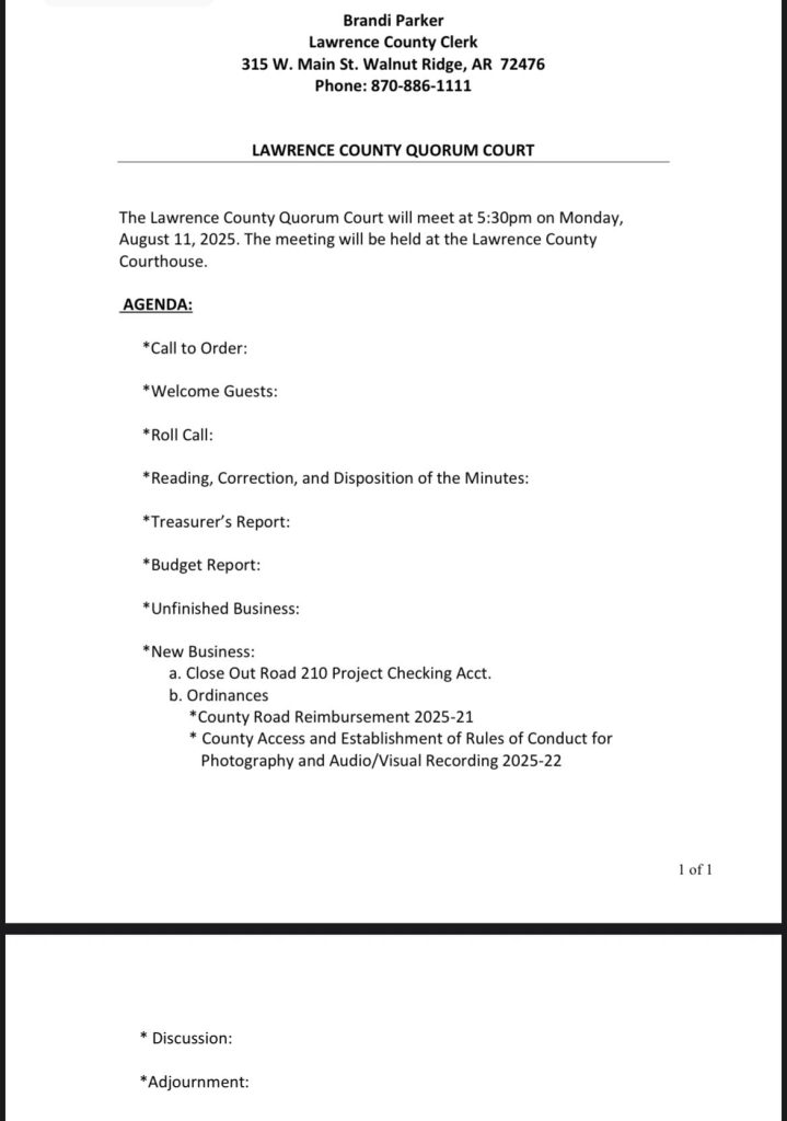 Economy, PoliticsQuorum Court agenda, Lawrence County Courthouse.August 13, 2025August 13, 2025By Editor0 0 Quorum Court agenda for Monday, August 11, 2025 at 5:30 PM at the Lawrence County Courthouse. Watch the recording of the meeting here!Lawrence County, AR Government
